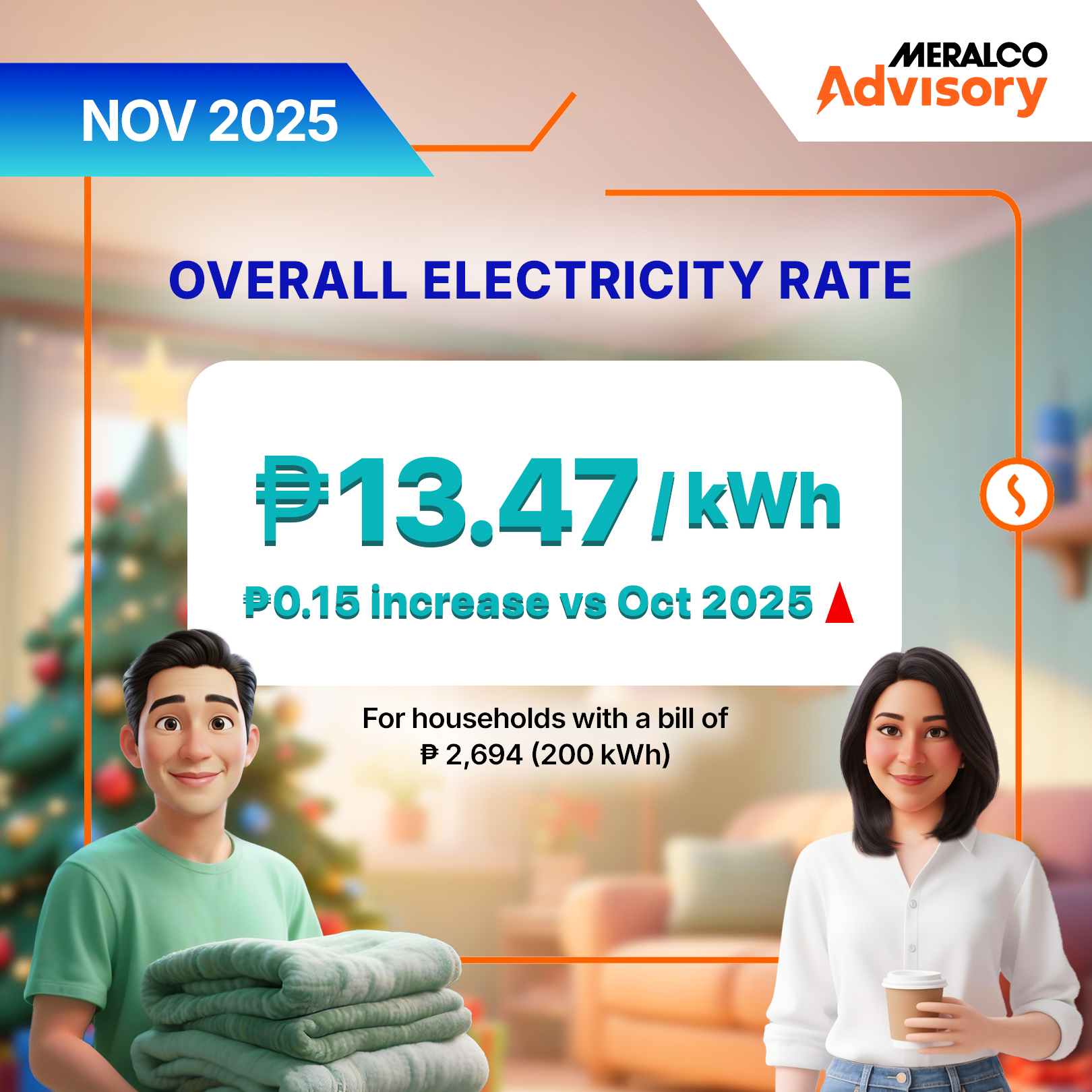 MANILA, PHILIPPINES, 10 NOVEMBER 2025–The Manila Electric Company (Meralco) announced today an upward adjustment of P0.1520 per kWh in the November electricity rate, bringing the overall rate for a typical household to P13.4702 per kWh this month from P13.3182 per kWh in October.