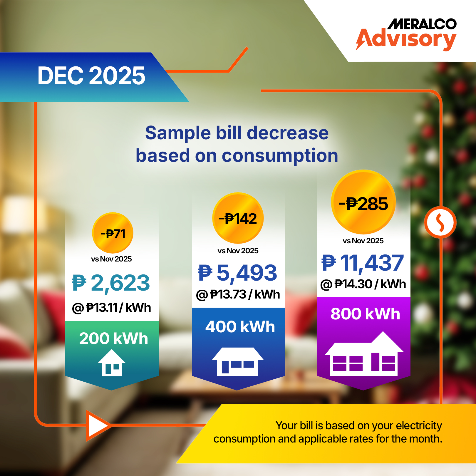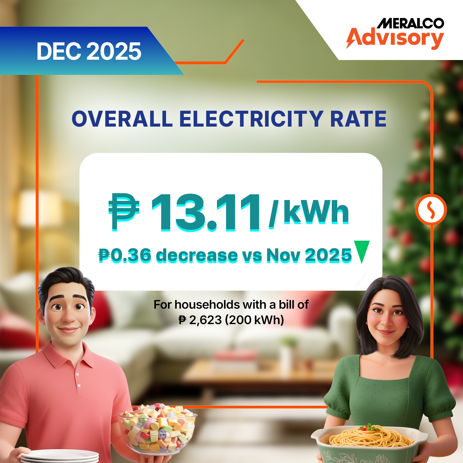 THIS DECEMBER MANILA, PHILIPPINES, 09 DECEMBER 2025 –The Manila Electric Company (Meralco) announced today a reduction of P0.3557 per kWh in the electricity rate this December, bringing down the overall rate for a typical household to P13.1145 per kWh from the previous month’s P13.4702 per kWh.
